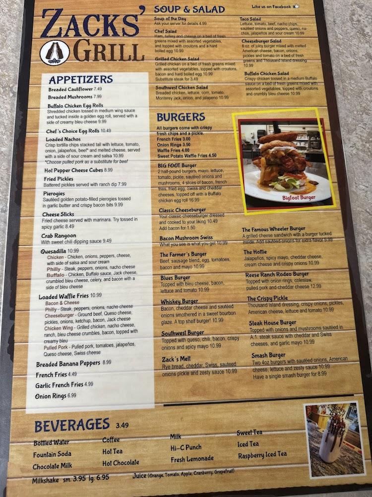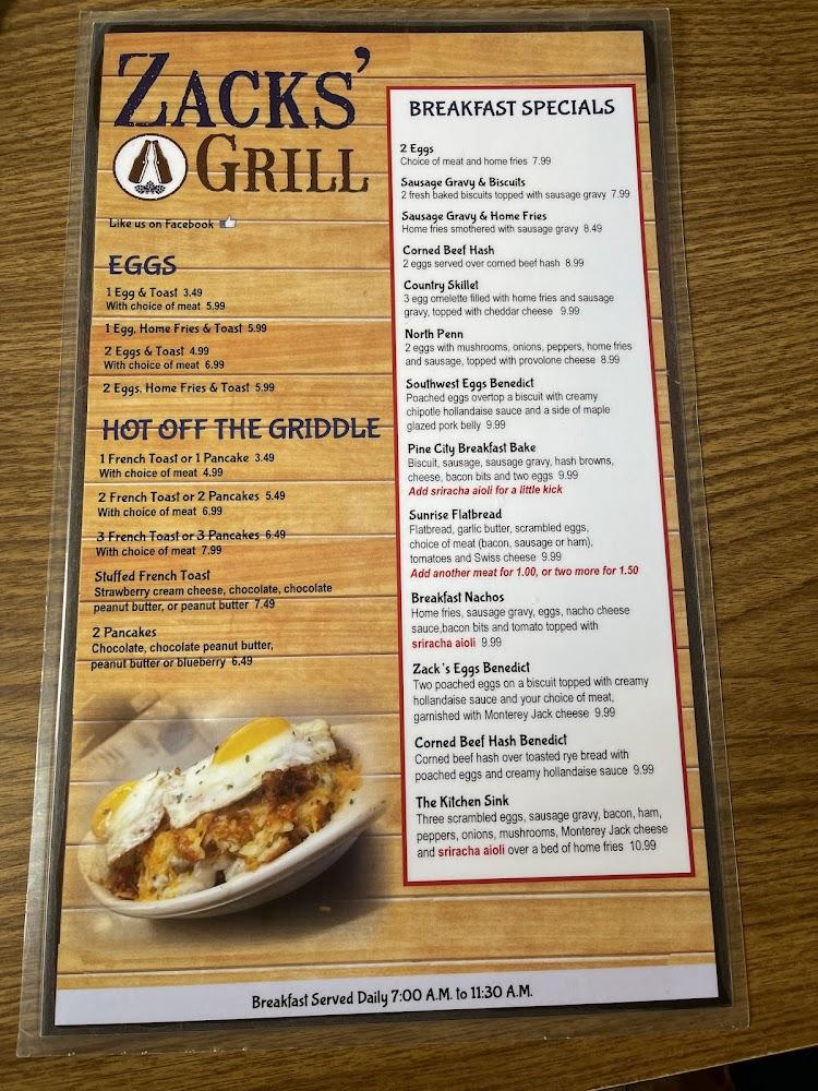 Welcome to Zacks' Grill, your go-to destination in Pine City for delicious grilled dishes and a vibrant atmosphere. Located at 1825 Penna Ave, we offer a wide range of options, from hearty breakfasts to delectable dinners, all at affordable prices. Enjoy a refreshing selection of local beers and expertly crafted cocktails, while catching live music and sports in a relaxed, family-friendly setting. With convenient takeout, dine-in, and delivery services, Zacks' Grill ensures that you can savor our delicious cuisine anytime. Our space is accessible for all, making it the perfect place for gatherings, whether it's a solo meal or a fun night out with friends.